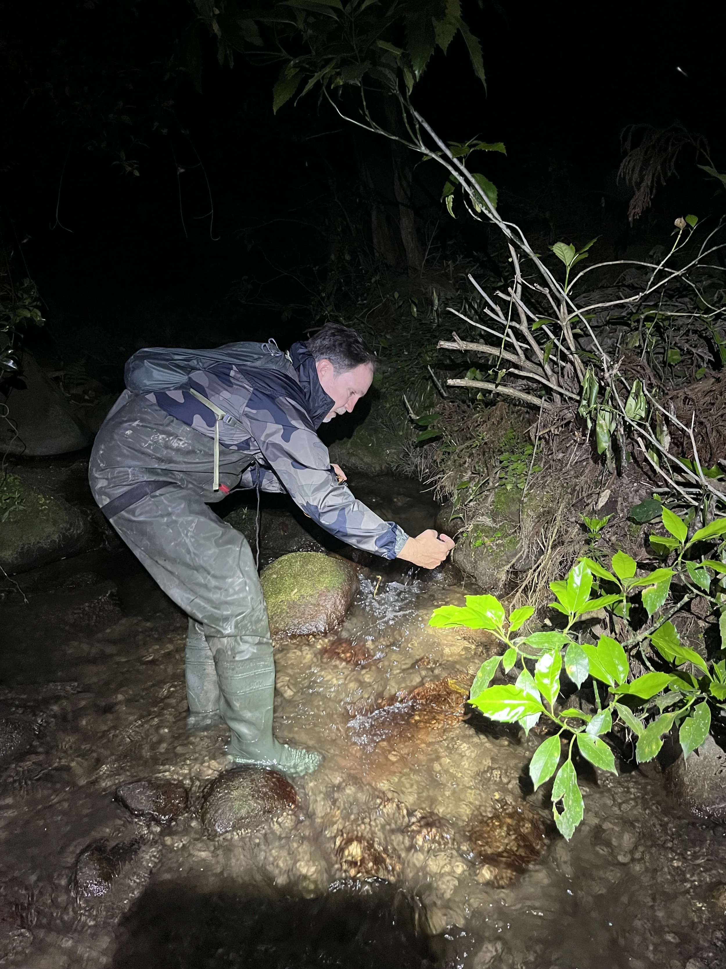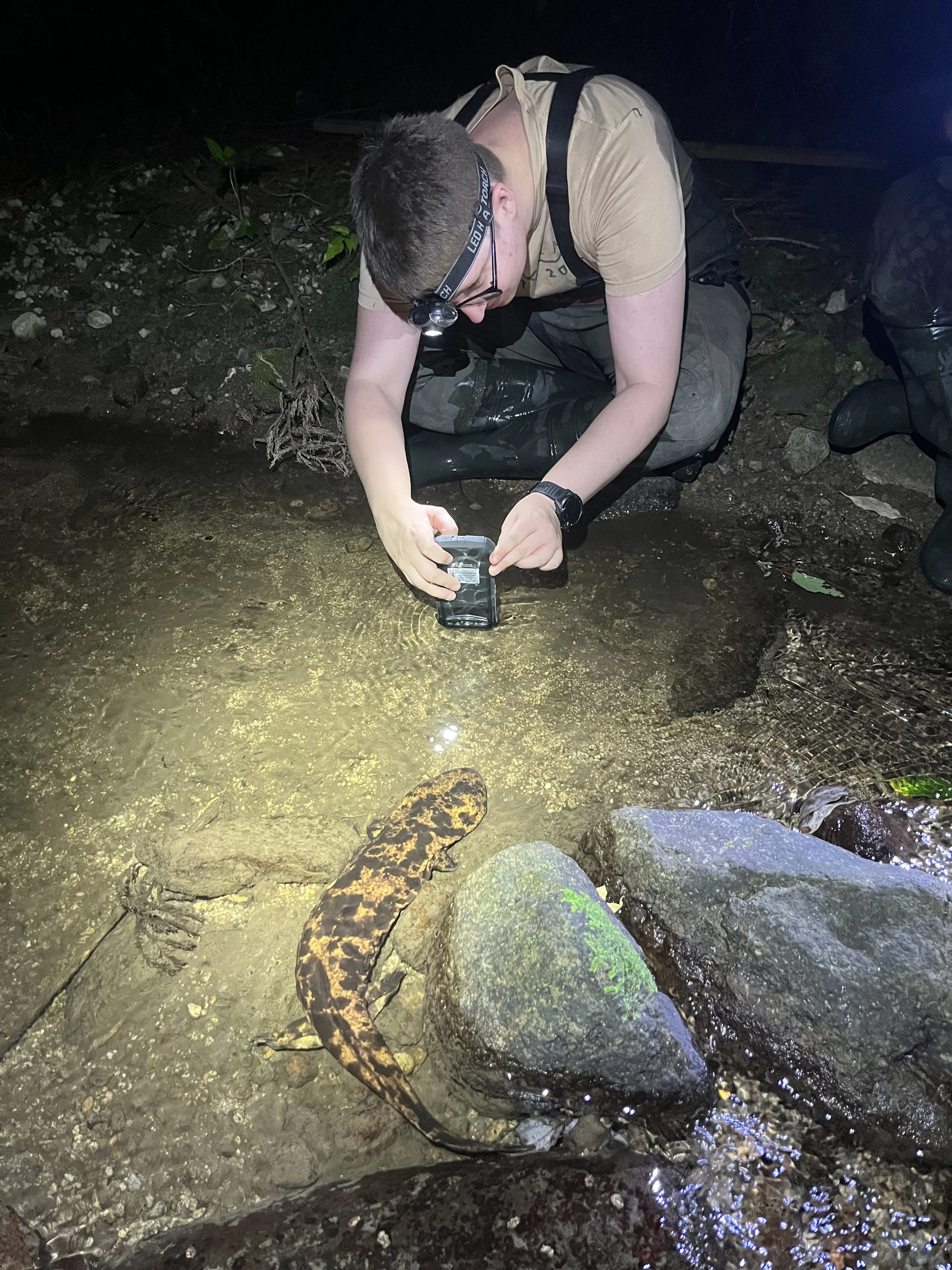 Japanese Giant Salamanders with local expert and guide, Richard Pearce. Wading carefully by